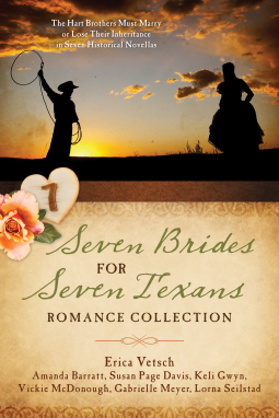 This book grabbed my attention and held tightly onto it from the very beginning with author Erica Vetsch setting the scene around the dining room table in the Prologue, through each author's story of one a Hart brothers looking or not looking for a wife, to the very end with Erica Vetsch's Epilogue. To say that I LOVED this book would be an understatement. I began reading it one afternoon, stayed up all night to finish it and have since read it again. This collection by seven authors reads like one great big novel. The book takes place from New Year's Day 1874 where the Patriarch of the family G.W. Hart tells his sons that they must marry by the end of the year or lose their inheritance, to New Year's Day 1875 with G.W. talking to the portrait of his late wife Victoria, reliving the past year. Author Gabrielle Meyer starts us out with "First Comes Love" the story of the youngest Hart brother, Hays. He is eager to be the first one to get married, to finally be the first at something in his family of seven brothers. He starts out by posting wanted posters around town. He runs into a challenge with the new pastor's daughter who is also the new school teacher Emma Longley. Next, we have "The Heart of Texas" by Lorna Seilstad giving us the story of Texas Ranger Chisholm Hart, away from home on New Year's Day, he gets the news of his father's terms by letter. Chisholm is a busy Texas Ranger, how is he supposed to find a wife? While tracking cattle rustlers Chisholm happens upon a feisty Mexican woman named Caro Marie Cardova Valenzuela. His partner Whit sees there is an attraction there and teases Chisholm about it. This story is full of suspense and danger. I won't give any spoilers but it is so good! Third, we have Amanda Barratt's "The Truest Heart." Annie Lawrence is returning to Hartsville a widow with a nine-year-old son. Her cruel father forced her to marry Stuart Lawrence while Travis Hart was away fighting in the war. She never stopped loving Travis and feels guilty for thinking of him on her one night with her husband before he too left for the war and never returned. Being the new midwife in town she is forced to work with Travis ,the town's doctor, on occasion. Clearly, they still have feelings for each other, can she overcome her guilty feelings? Can she stand up to her father? There is so much tension and drama in this story, the cruelness of Annie's father is unbearable and makes me hate him. But I loved how this turns out. Next, we have author Keli Gwyn's "A Love Returned" the story of Houston Hart. Houston left for California instead of going to war with his older brothers, some townsfolk didn't care too much for that. Before Houston left Hartsville, he proposed to Coralee and asked her to go with him to California, but she turned him down saying she couldn't go. He left without finding out why. Now, after receiving a letter from Travis about his father's edict, he has returned home. Having a better head for business than ranching he would work hard to show his brothers and father that he was serious about his duties to the 7 Heart. This story touched my heart so much, it is impossible to describe. Houston finds out why Coralee could not go with him with such a tender act of kindness, Coralee could not help but let a few of the bricks she had built around her heart fall. There is so much healing and love in this story. Make sure to have some tissues handy. Number five, "For Love or Money" by author Susan Page Davis is the story of Crockett Hart. It's September, Crockett spends most of his time out tending the huge herd, he was away on a cattle drive and now he is out on the range looking for wondering cattle. Thinking, he just isn't ready to be married yet, or there aren't enough suitable candidates in Hartsville. Crockett smells smoke and rides off to a not so friendly neighbor's ranch to find their small house fully engulfed in flames. He sends up a prayer when he doesn't see any of the family. He gets off his horse to try to save the ramshackle barn. Jane Haymaker shows up and sees him, together they save what they can. Jane and her brother Ben had been friends with the Hart's when they were young but after the death of her mother she and Ben left school to work the small ranch with their father Boyd, who was a lazy drunkard. You will need some tissues for this story as well. Drama and mystery, the kindness of the community coming together and perhaps the blossoming of love fill this story. Author Vickie McDonough's "Mail-Order Mayhem" tells the story of the oldest Hart brother Austin. Was he making a mistake in writing for a mail-order bride? He has worked so hard on the ranch and could not lose it, he had no choice but to find a wife. He felt the full responsibility of the ranch was on his shoulders. When his bride stepped off the stage he couldn't believe how his heart bucked, but then she turns her back to him and helps her identical twin sister down. The second woman was Jenny, his bride, but where was the feeling in his heart? Rebekah, the sensible twin makes up for Jenny's lack of introduction and tries to smooth things over with Austin, Jenny had not told him that she was bringing her sister along. Jenny is not pleased with the town or Austin. Rebekah wishes she would be kinder, this has to work, they were about to be homeless. While in their room at the hotel, Jenny admits that Austin does not make her heartbeat speed up, Rebekah on the other hand, keeps it to herself that her heart took off like a racehorse more than once but she has agreed to wed someone else. This story is full of twists and surprises! Is it wrong that Austin feels for Rebekah what he should be feeling for Jenny? The ending of this story will have you on the edge of your seat! Now we come to "Love at Last" by Erica Vetsch. The story of Bowie Hart, the second oldest brother was not the same after the war where he lost an eye and had been badly burned, still having dark scars from the black powder